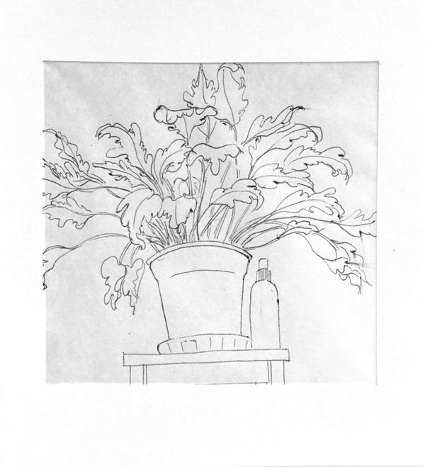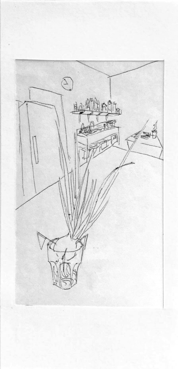 I was talking to Pascale about my mom, who puts the root part of vegetables in a glass of water to grow and which later become part of her kitchen garden. The following day, Pascale brought along an onion which had already sprouted a tiny ‘green hat’. This has now grown into a ‘mohawk’ hairstyle. I suppose we haven’t had the onion for lunch yet because we’re waiting for the flower – a ‘punk head’ – to appear.